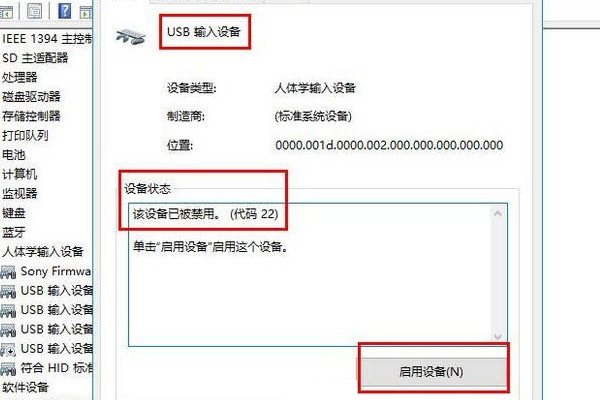 6、进入usb输入设备属性的界面,在下方设备状态可以看到该设备已被禁用,点击下方的启用设备即可。