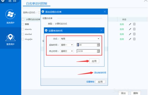 6、点击下方的“添加有效时间”,设置登录的时间段,点击应用,这样即可完成网站安全认证操作。