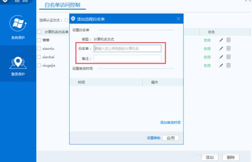 5、在弹出的“添加远程白名单”窗口中,输入计算机名和备注。