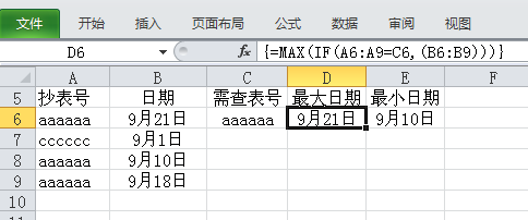 查找表号为 aaaaaa的最小日期,公式为:=MIN(IF(A6:A9=C6,B6:B9)),同样是数组公式,需要在输入公式后按住三个键。