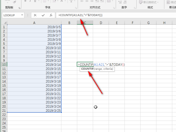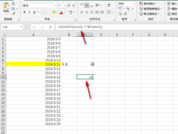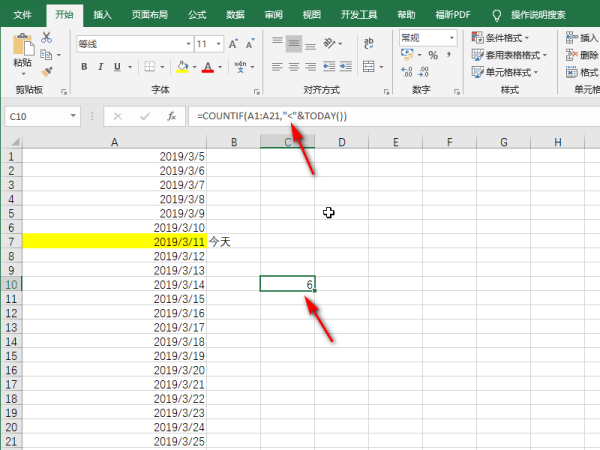 5、如果我们想要求小于今天日期的个数,可以将函数修改为“=COUNTIF(A1:A21,"<"&TODAY())”即可。
