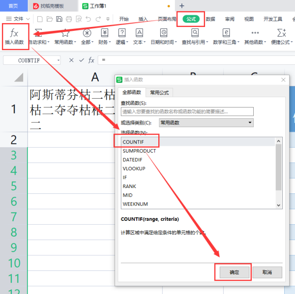 2. 【公式】选项卡中的【插入函数】,弹出【插入函数】对话框,选择【COUNTIF】函数;如下图。