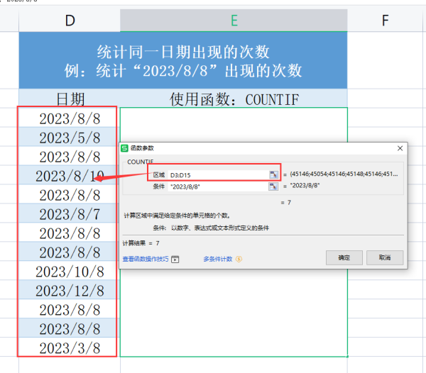 3. 进入【函数参数】对话框,【区域】中选择表格格所有要统计的日期单元格(如下图所示),【条件】中输入“2023/8/8”;注意:日期必须用“双引号”引上,并且“双引号”必须是英文状态下输入的双引号。