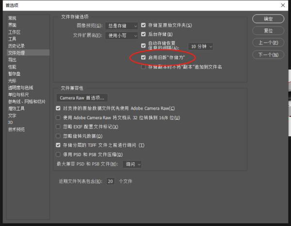 按Ctrl+k打开首选项,或者“编辑”-“首选项”,在文件处理里勾选启用旧版“储存为”,就能解决了。
