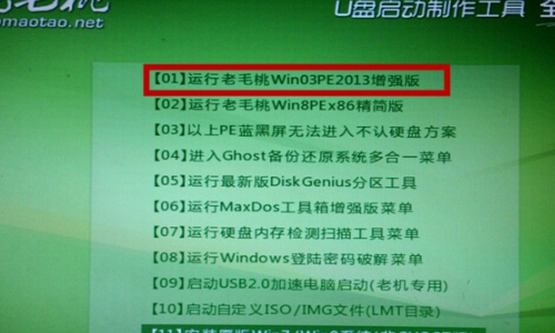 接着选择【02】运行老毛桃win03PE2013增强版,然后按下回车(enter),如下图所示。
