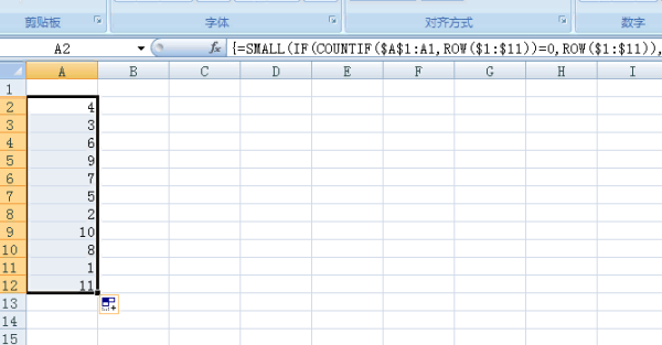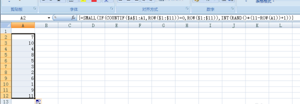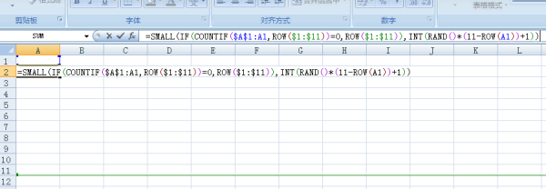 首先,在A2单元格中输入公式:=SMALL(IF(COUNTIF($A$1:A1,ROW($1:$11))=0,ROW($1:$11)),INT(RAND()*(11-ROW(A1))+1))