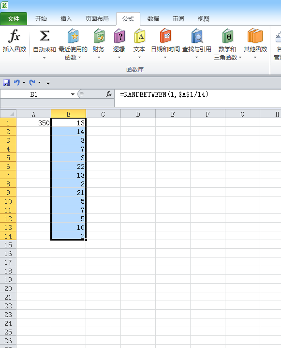 =RANDBETWEEN(1,$A$1/14) ,下拉B1到B14;