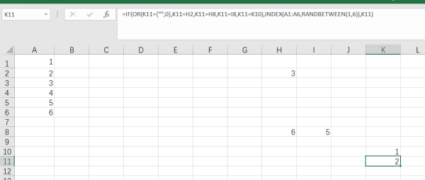 K11=IF(OR(K11={"",0},K11=H2,K11=H8,K11=I8,K11=K10),INDEX(A1:A6,RANDBETWEEN(1,6)),K11)