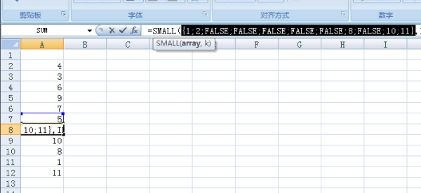 4、好了,一组不重复的随机数字生成了,现在我们回头看看这个公式是怎么实现的吧。首先看Small函数的第一个参数,也就是数字区域,这里是利用if和Countif函数来实现此单元格上面的单元格区域,是否有当前单元格的数字,如果有,就返回False,而如果没有就返回这个数字,从而生成一组由上面单元格没有的数字和Flase组成的序列,下图是按F9得到的结果: