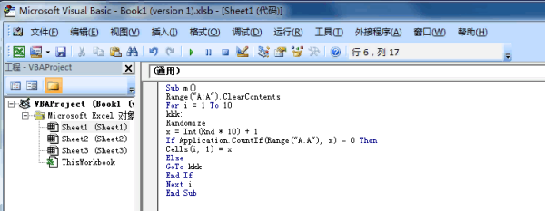 2、代码原理很简单,就是随机生成数字,如果A列中有了这个数字,就返回再次随机生成,一直到没有这个数字为止;利用循环生成制定数量的数字。