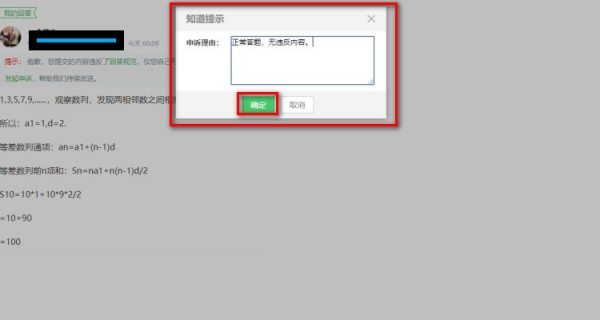 3、输入理由,按照自己想说的写,可以写“正常答题,无违规内容”,然后,点击“确定”。