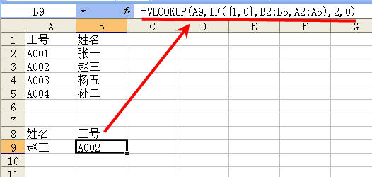 公式:=VLOOKUP(A9,IF({1,0},B2:B5,A2:A5),2,0)