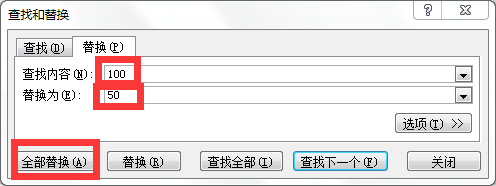 (2)在弹出的对话框中,“查找”栏输入“100”,替换栏输入“50”,点击“全部替换”即可。