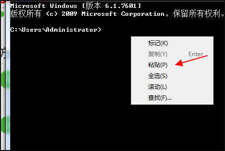 3、然后在弹出来的命令符界面中,右键单击选择粘贴,将这一条代码“for %1 in (%windir%\system32\*.dll) do regsvr32.exe /s %1”复制粘贴进去,按下enter键。