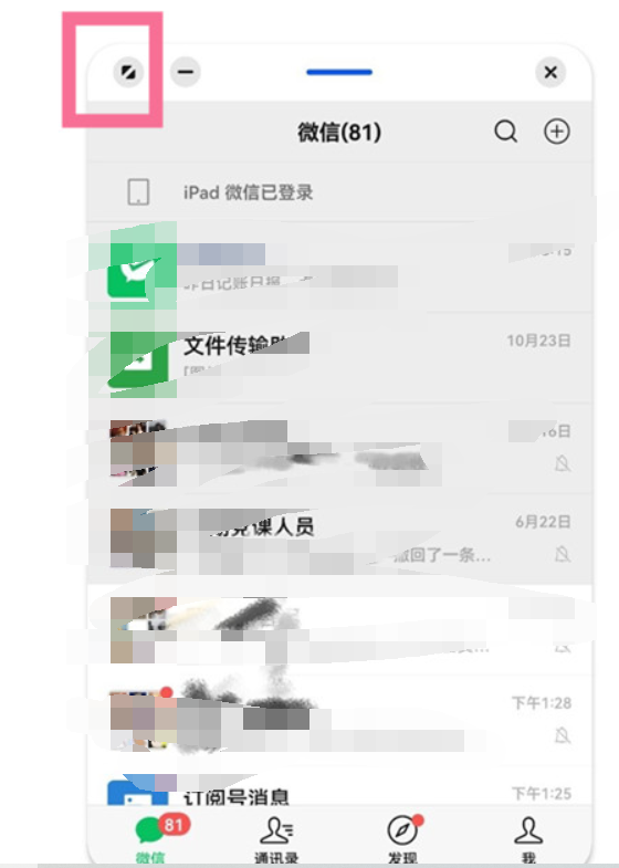 2、然后再点击【拉伸图标】即可恢复微信满屏,如下图所示:
