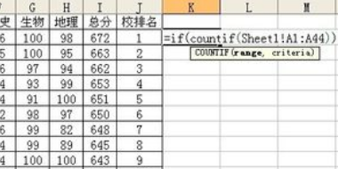 4、再次切换到表格 1, 当这个函数成为了=if(countif(Sheet2!A1:A44))