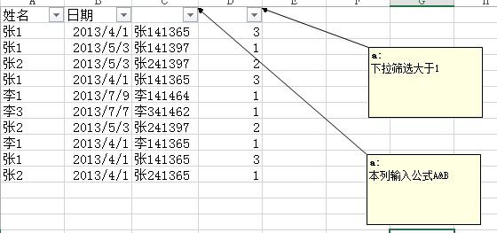 1、选中这一列(可用鼠标直接点击相应的列标,也就上面的A,B,C。。。。。) 2、点“自动排序”(在菜单栏下面,大约第22个图标) 3、自动排序后会在这一列第一行生成一个三角形,点击这个三角形,在弹出的列表可选择“降序排列”或“升序排列”均可。excel表格中想筛选出1列时间相同,同时另一列姓名相同的