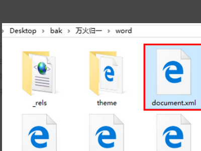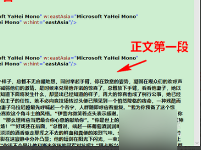 6、打开 xml 文件以后,开头是一大串密密麻麻的代码字符,往下面拉,在页面下方,就可以看到 docx 文档的内容了。