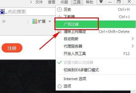 2、在下拉菜单中如图下选择【广告过滤】一项进入界面操作。