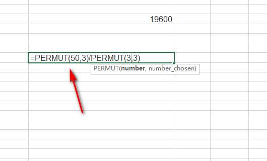 3、输入排列公式=PERMUT(50,3)/PERMUT(3,3)。