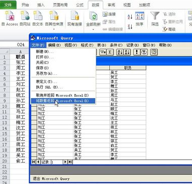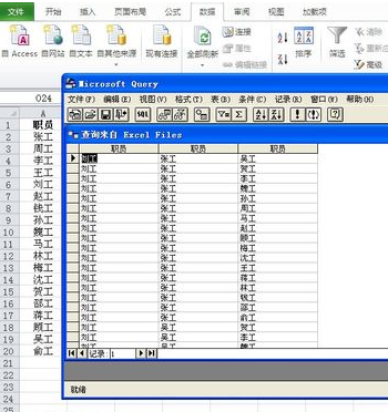 where A.职员 order byA.职员,B.职员,C.职员 点击确定。 8、稍微等待一下,系统会把满足条件所用排列组合显示出来。 9、最后选择Query"文件"菜单下"将数据返回到EXCEL"选项。 10、弹出"导入数据"对话框,鼠标单击D1单元格,确认数据导入在D1单元格,确定,当然也可以把结果放在新工作表中。 11、因为全排列的数据量很大,有969种排列组合,把EXCEL表进行了窗口冻结操作。 12、后续对结果进行处理,打印出抽签条即可。