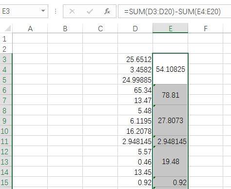 选择E3:E20单元格,输入以下公式,按Ctrl+Enter组合键结束,