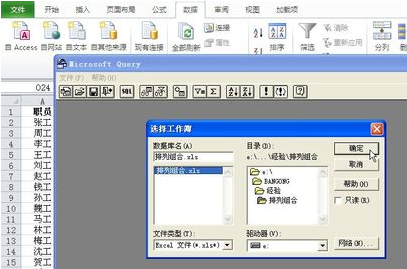 4、打开存放在电脑E:盘上的"排列组合.xls"文件,作为外部数据源。