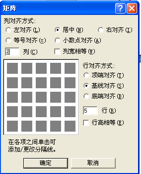 word插入矩阵的方法 很多研究数学问题的朋友在使用word录入文档时,经常会遇到要输入数学公式的情况,下面是我整理的word插入矩阵的方法,希望对你有帮助! 1、为了大众化,我们就选用word里面自带的公式编辑器,为大家讲解,其界面如下 2、我们打开word,将光标定位于要插入矩阵的地方,点击插入——公式,这样就可以调查公式编辑器界面了 3、首先我们先插入矩阵外边的.括号:这个相对简单,点击如图的位置即可 4、插入里面的行和列,点击下图的位置,会出来一个矩阵对话框,我们在里面输入行数和列数。 5、通过上面几步我们就可以在里面输入我们的矩阵了,如图所示,我们的是一个3行2列的矩阵,我们在其中输怎么打矩阵,在word公式编辑器里。