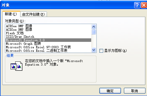 2、弹出对象对话框,在新建选项卡上选择Microsoft Equation 3.0,如图所示;