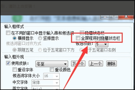 5、接着将打开对应输入法设置界面,在此以“搜狗五笔输入法”为例,切换到“外观”选项卡,清除勾选“全屏时隐藏状态栏”项。