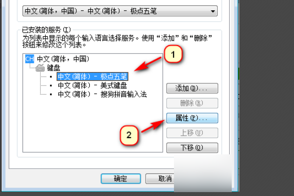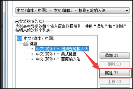 4、使用鼠标左键选中极点五笔,然后点击右边的属性。