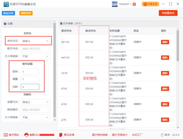 步骤2,在软件的左边进行设置,文件命名方式选择“自定义”,然后直接进行编号设置,起始右边设置成1,增量右边设置成1,位数右边设置成3,这时候在右边可以预览到新文件名已经变成了001,002,003...