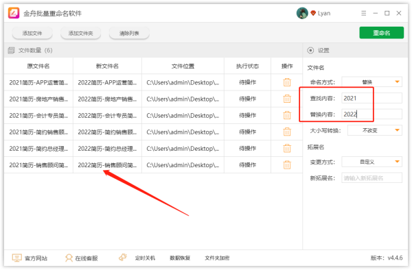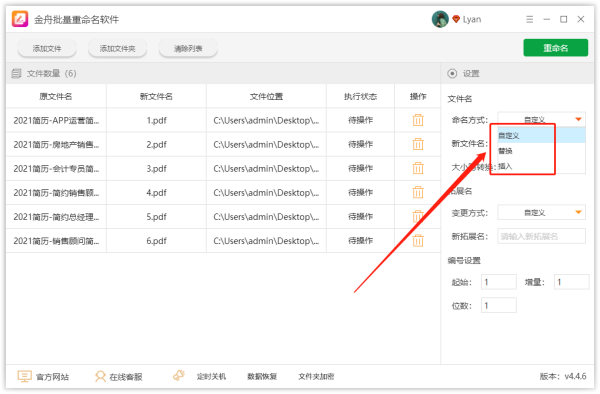 二、软件重命名共有以下三种模式,自定义:文件名统一 替换:用新的字符替换旧的字符 插入:在文件名某一位置插入新内容