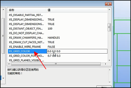 3、然后在弹出来的窗口中点击打开右侧中的“XS_GRID_COLOR”选项,使用 0 到 1 的 RGB 值定义颜色。例如,要将颜色更改为红色,可将值设置为1.0 0.0 0.0.;