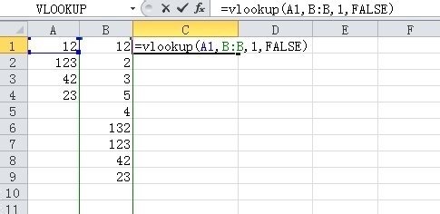 2.那么我们在C列中输入函数vlookup匹配函数,找出存在的项目并显示出来;第一列是A1然后用逗号隔开,就可以点击提示的第二个参数;第二个参数我们直接点击第二列即B列。