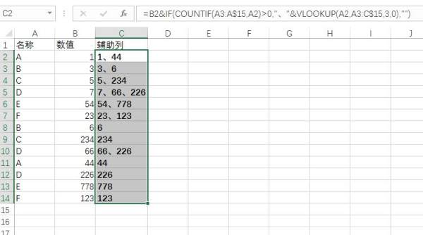 =B2&IF(COUNTIF(A3:A$15,A2)>0,"、"&VLOOKUP(A2,A3:C$15,3,0),"")