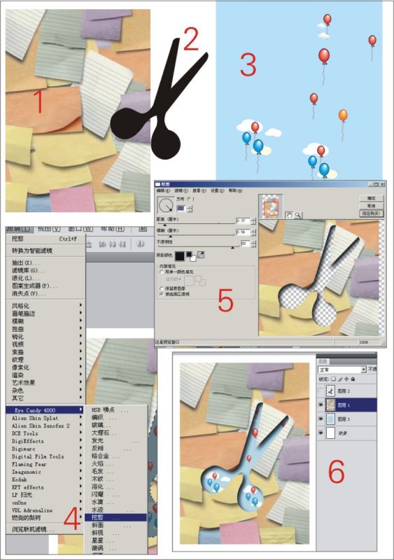 为了回答你我做了三张素材,第一纸张,第二剪刀 第三气球。然后分别导入到ps中按我的图层依次摆好,然后把剪刀调成选区----来到纸张图层,然后选择滤镜插件点击确定。看图