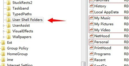 2.展开注册表左侧树形菜单,进入此路径“HKEY_CURRENT_USER\SOFTWARE\MICROSOFT\WINDOWS\CURRENTVERSION\EXPLORER\USER SHELL FOLDERS”可以看到右侧出现了“我的文档”里各个项目的设置项。