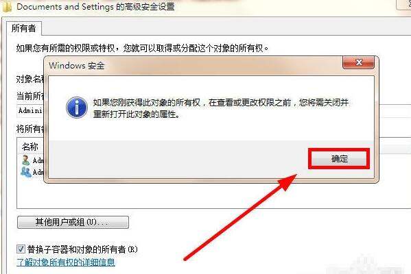 6、进入所有者编辑页面,然后选中管理员组,同时将“替换容器和对象的所有者”功能打开,然后确定即可: