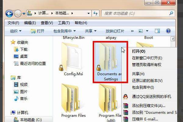 3、返回到C盘中,然后在页面中找到“Documents and Setting”文件夹,鼠标右键点击属性: