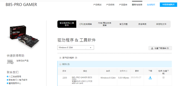 目前华硕B85-PRO GAMER主板最新bios版本为2203,可以至华硕官网输入产品型号,点击服务与支持——驱动程序&文件——选择系统——BIOS进行下载。