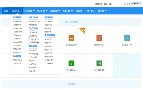 步骤二:点击导航栏上上方得文档转换并在下拉框内选择PDF转cad,然后点击后面的相应弹出来的文件添加框,在后面的文件框中点击上传我们需要进行编辑转换的PDF图纸文件即可。