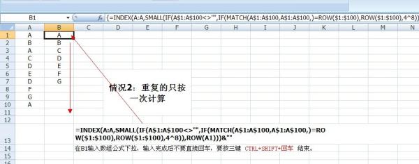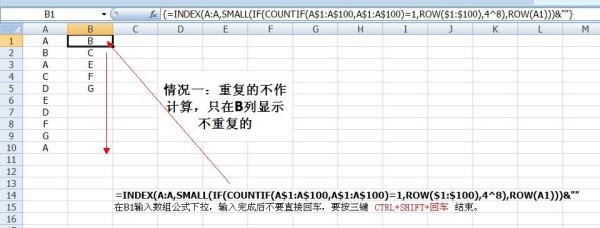 情况一公式:重复的不作计算,只在B列显示不重复的。
