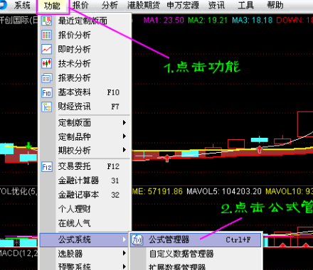 1、打开通达信版本的炒股软件,点击软件最顶上的导航栏的“功能”选项。找到功能选项中的,公式系统,右边会有公式管理器。点击公式管理器,即可打开通达信软件的公式管理器。