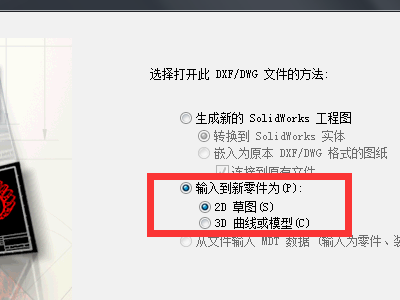 5、然后会提示:打开dwg文件的方法,这里选择:“输入到新零件”-“2d草图”。