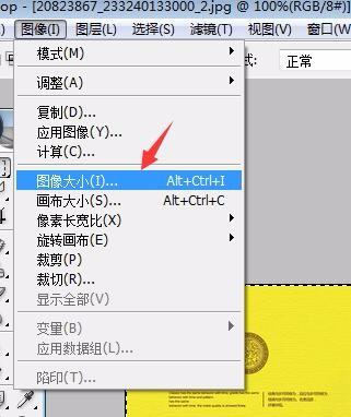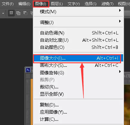 第二步:选择”图像“菜单栏下的”图像大小“选项。也可以直接使用快捷键”ALT+CTRL+I“。