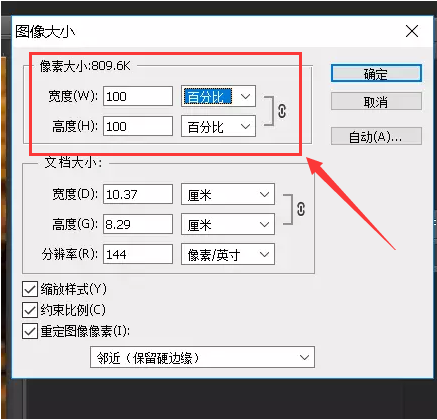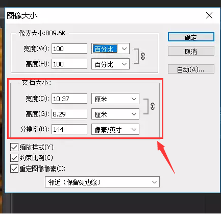 第四步:在”文档大小“栏目更改图片的宽度和高度,并且需要注意的是数字后面的单位。如果不需要保持原图片的长宽比例,可以点击右侧的链条标志,取消关联。