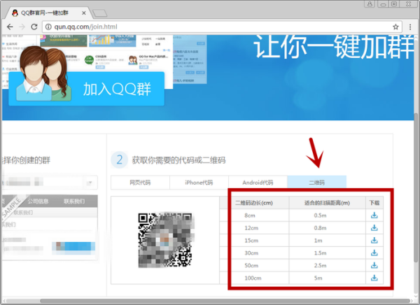 6,点击二维码,可以下载不同尺寸的二维码,让好友通过扫一扫二维码来加群。