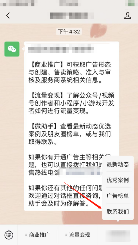 进入微助手界面,联系官方人员即可开通广告投放,进行宣传。