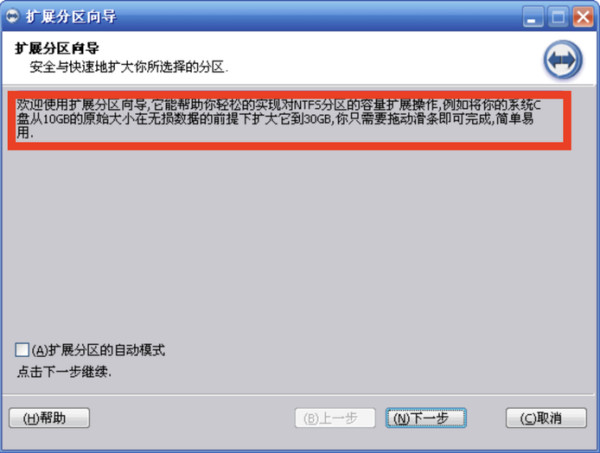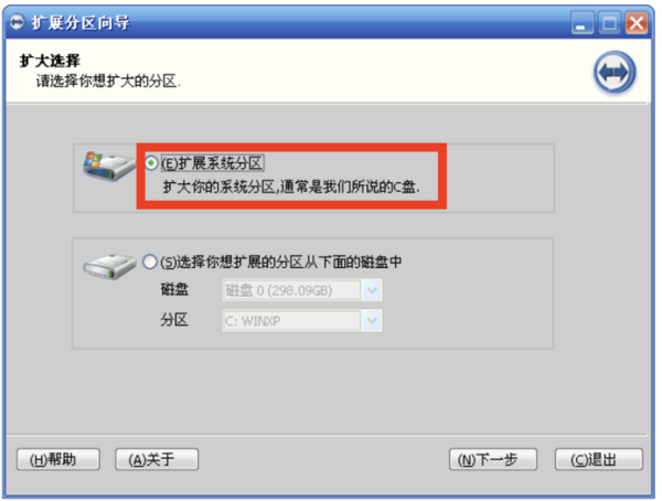 3、点击“扩展分区向导”,之后会弹出个窗口,在此窗口中选择你想扩大的分区,这里我们选择第一个扩展系统分区,然后点击下一步。